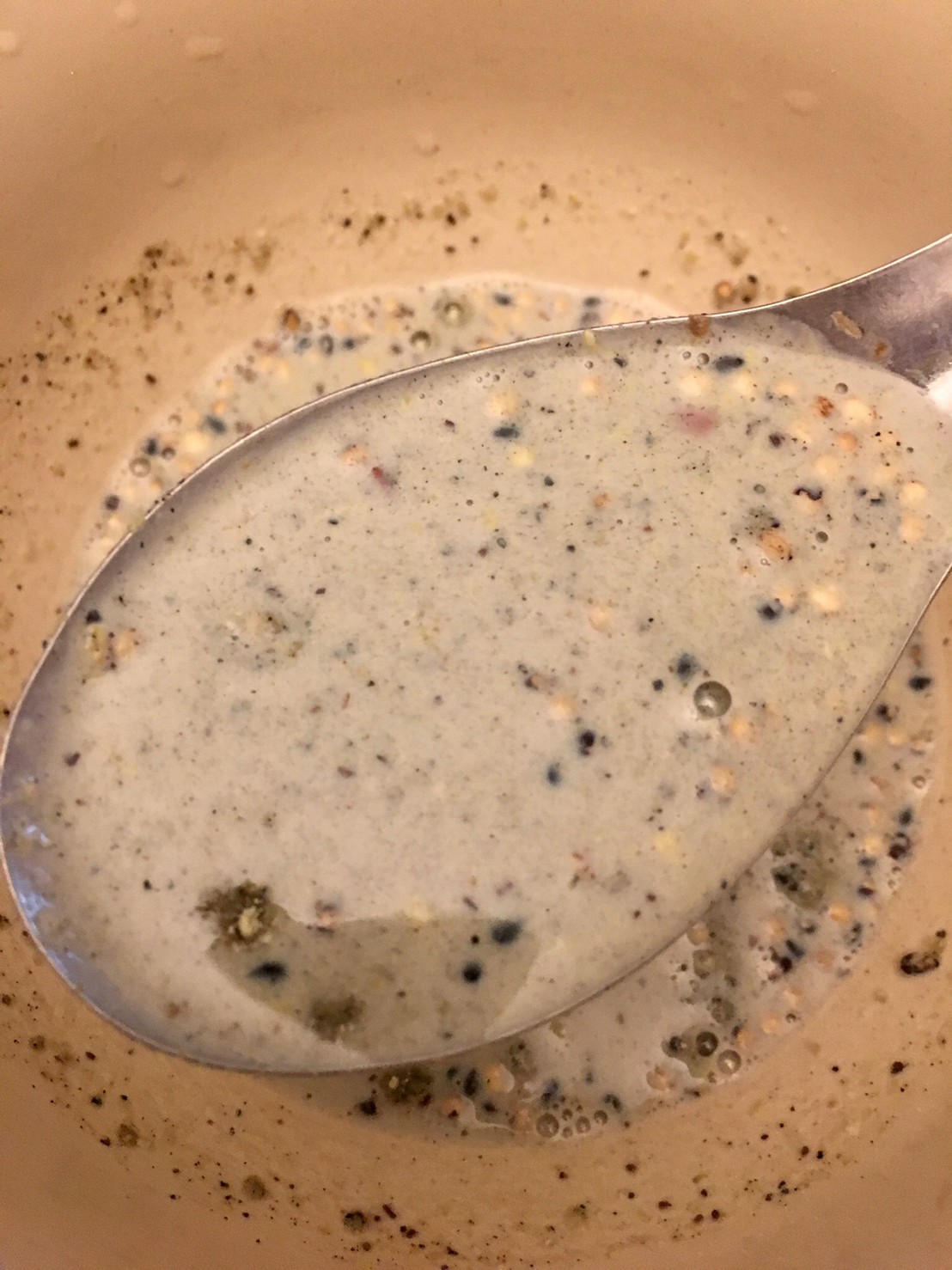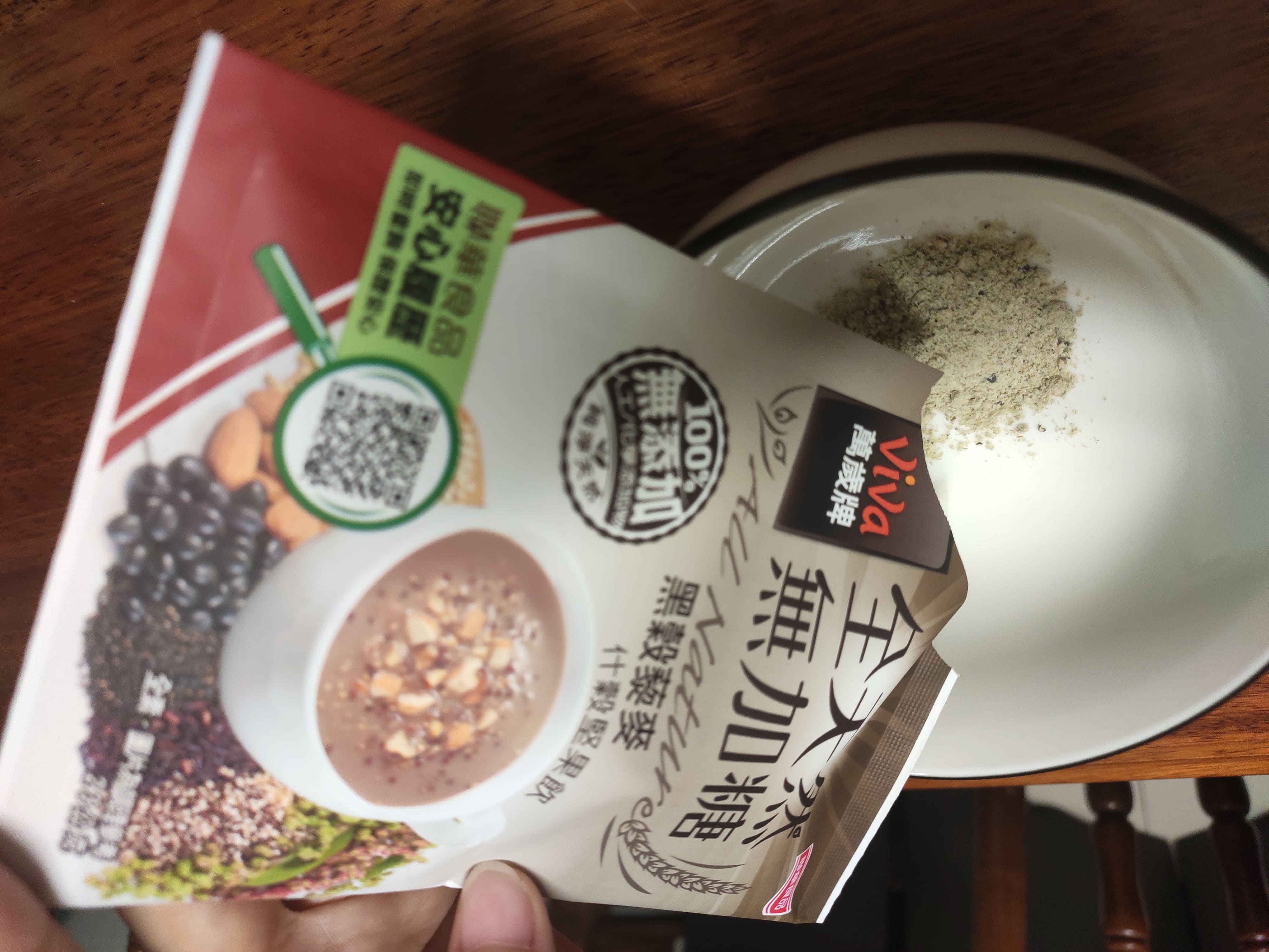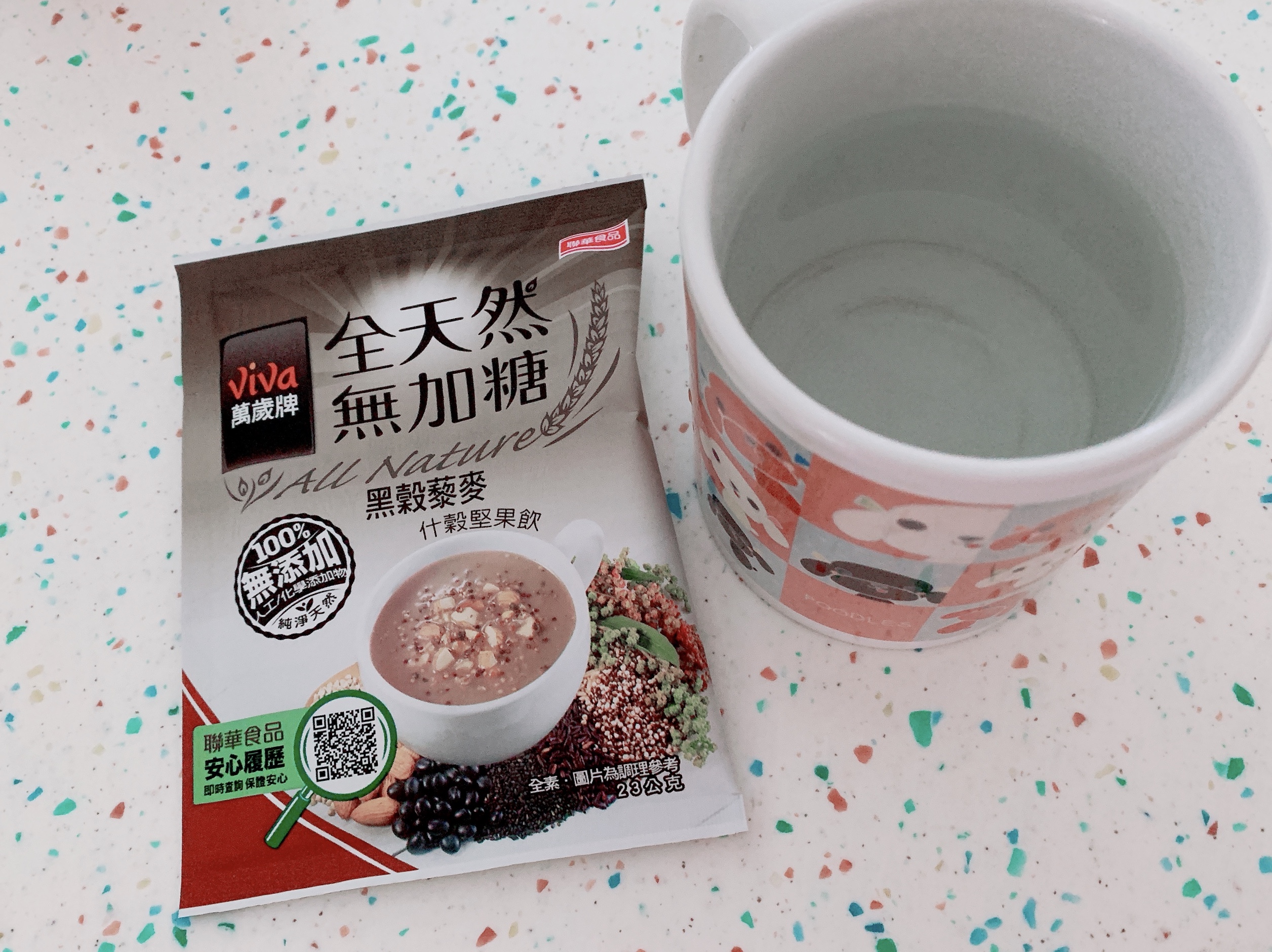 看到包裝上寫說可以加牛奶,但家裡沒牛奶,所以我用奶粉替代,順便加了冰塊變冰飲,加了奶粉後顏色變灰色,重點是喝起來順口很多!多了奶粉中天然的乳糖,讓整杯沖泡飲多了一絲絲的甜味,喝起來不再那麼「養生」,而且泡成冰飲對我來講很像在喝無糖~一分糖飲料,還有很多堅果穀物的小顆粒,增加咀嚼口感,原本覺得很難喝的感覺都煙消雲散了。