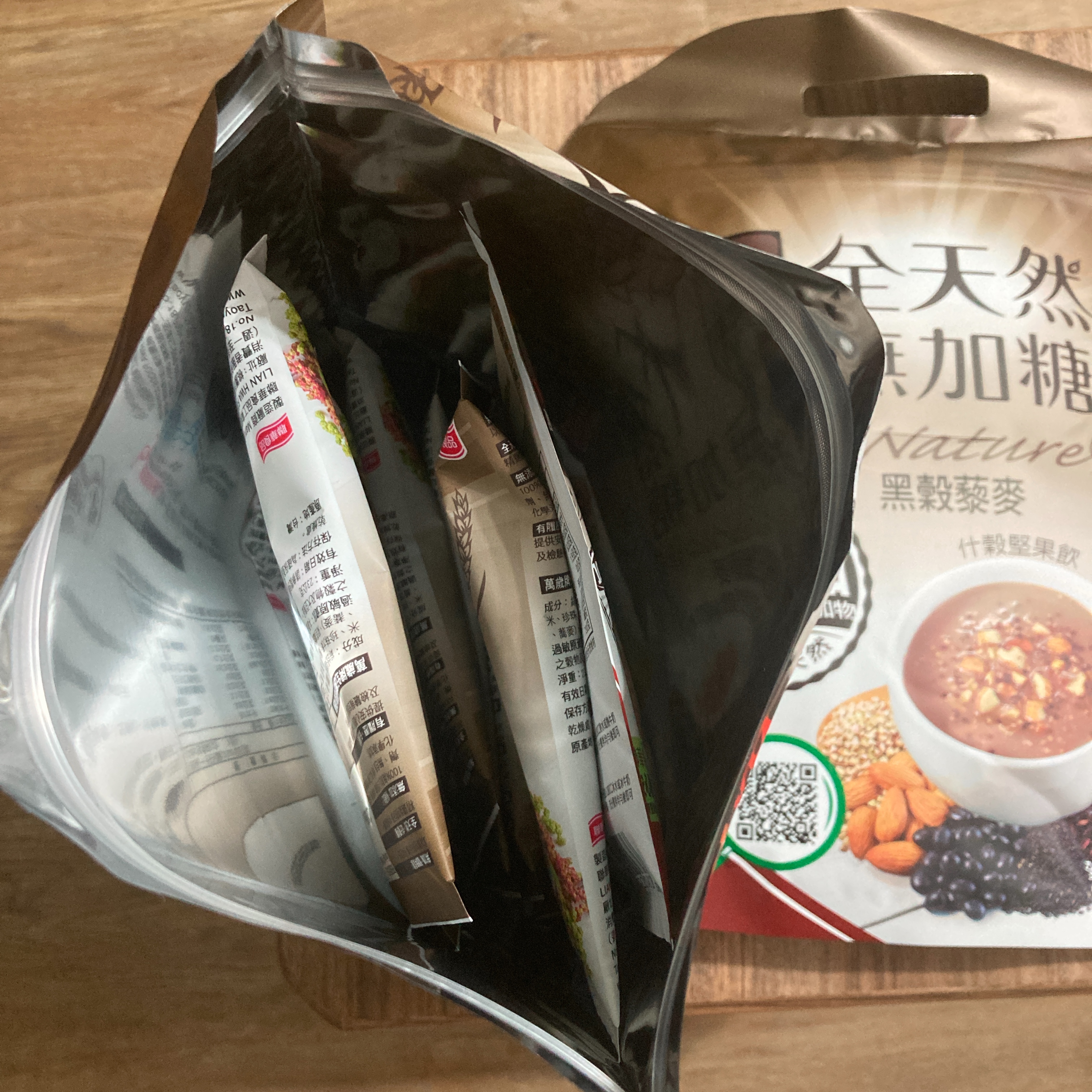 36歲 彰化縣晚上肚子有點饞時即沖泡一杯作為消夜,打開包裹內有兩袋,每袋打開內有十包,袋子封口處有夾鏈可封口,裡面的小包我拿起後是覺得小包的袋子太大了,因為裡面填充的穀物粉末約1/3~1/2的量卻使用如此大的袋子感覺比較浪費(或許是為了填充惰性氣體而需要較大包裝?)﹔我個人對於沖泡穀物比較喜歡的飲用方式是加上溫牛奶,沖泡時注入溫牛奶時即散發香氣十足穀香堅果味及淡淡的茶味,裡面有未磨成粉末小顆粒狀的,喝起來有濃厚的感覺,且品嘗時因裡面有顆粒,咀嚼時也一併散發堅果香,整體喝起來有飽足感可作為小點或消夜品嘗。